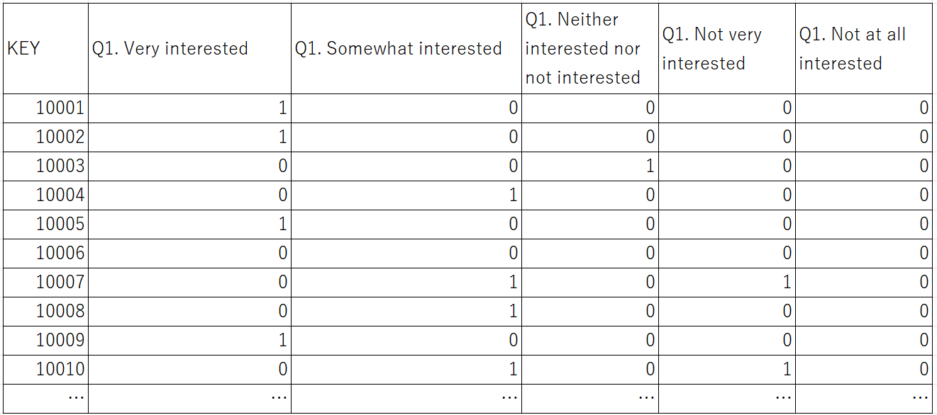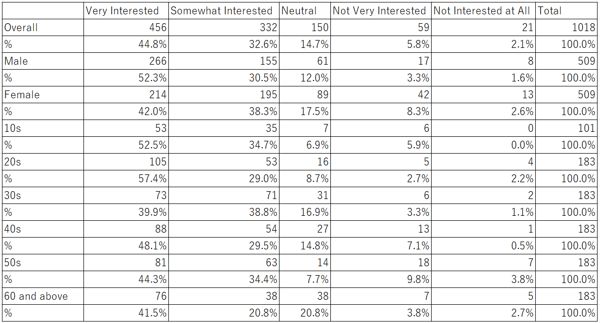 In the simple tabulation previously shown, we could only grasp that many people were interested. However, looking at the cross-tabulation table, we can see, for example, that there is not much difference in interest between genders. When analyzed by age group, it shows that people in their 20s have the most interest, although there is also noticeable interest from those in their 30s and older.