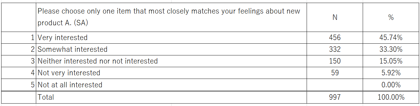 Analyzing the simple tabulation table above, we can see that 79% of respondents indicated they are "very interested" or "somewhat interested" in the new product A, suggesting a high overall level of anticipation for this product.