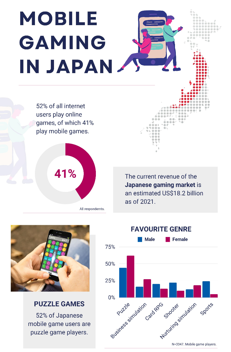 Female users tend to play games that revolve around relaxation, growth, puzzle-solving, and dressing up, while male users opt for games that require strategy, growth, and competition. Of the respondents that chose relaxation as a reason for game enjoyment, 47% were female and 26% were male. In comparison, when it comes to strategy, male gamers accounted for 21%, while female gamers accounted for 9%. Japanese mobile gamers also tend to lean towards games that offer casual, “otherworldly magic” themes.
