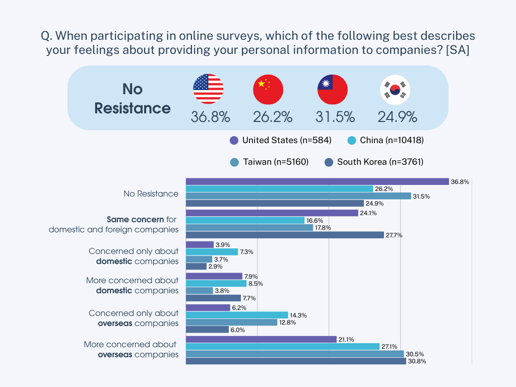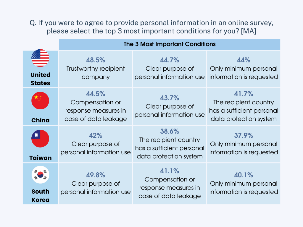 To understand how online survey participants feel about providing personal information internationally, we conducted a comprehensive research across the U.S., China, Taiwan and South Korea. The survey results reveal their key considerations for conducting surveys with personal information collection.