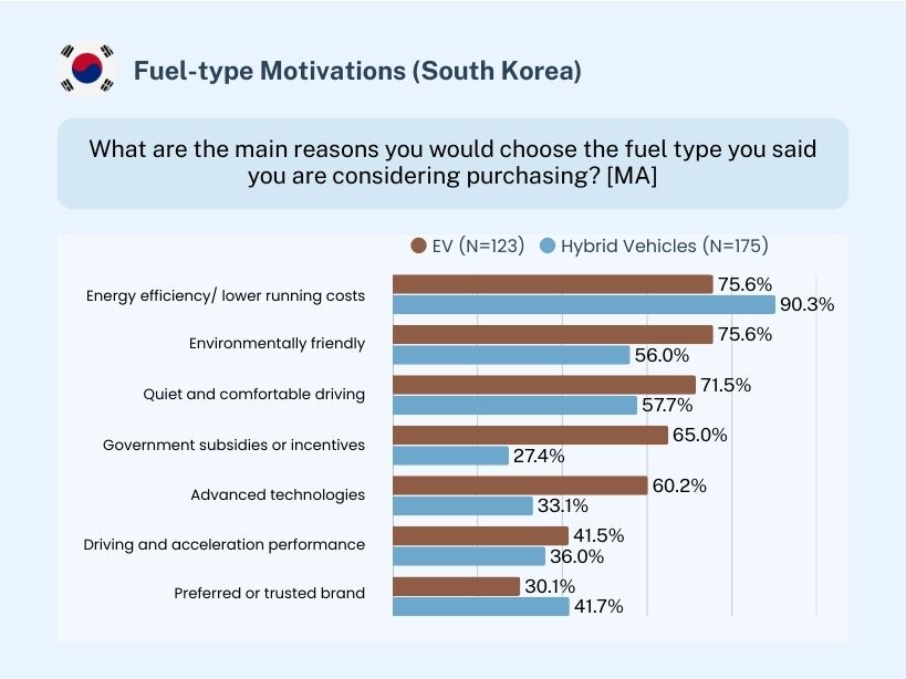 Fuel-type motivations reinforce Korea’s “baseline + added value” structure. Hybrid vehicles are strongly anchored by fuel efficiency (90.3%). EV is also supported by fuel efficiency (75.6%), but differentiates via environmentally friendliness (75.6% vs. 56%), government incentives (65% vs. 27.4%), advanced technology (60.2% vs. 33.1%), and quiet and comfortable driving (71.5% vs. 57.7%).