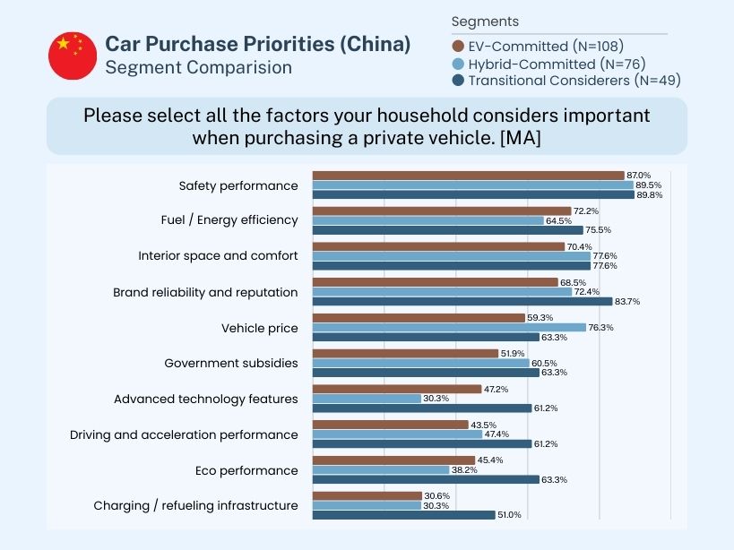 According to the survey result, general car purchase priorities show a stable “baseline first” logic of vehicle price (68.8%–77%), fuel/ energy efficiency (62.5–75%), and safety (57.8–68.8%) across segments. The decisive differences appear mainly among Transitional Considerers, who require proof on ownership practicality—driving/acceleration performance (50% vs. 29% in other groups), after-sales/dealer network (45.8% vs. 18.8%-27.4%), and charging infrastructure (37.5% vs. 22.6%-26.6%).