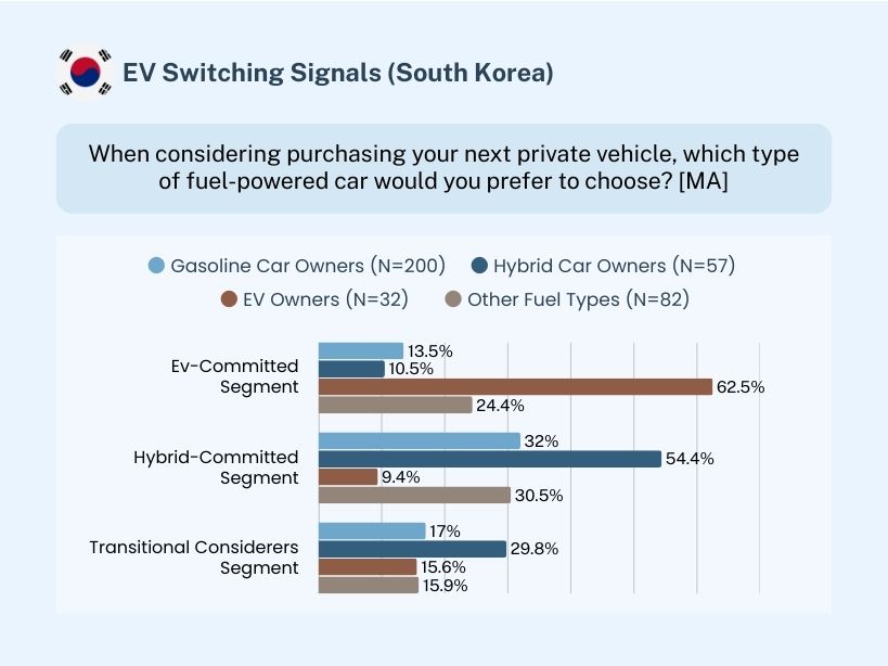 Switching intentions from gasoline or hybrid vehicles to exclusively EVs remain limited, reflecting a cautious switching environment, with hybrid vehicles continuing to function as the dominant transition anchor.