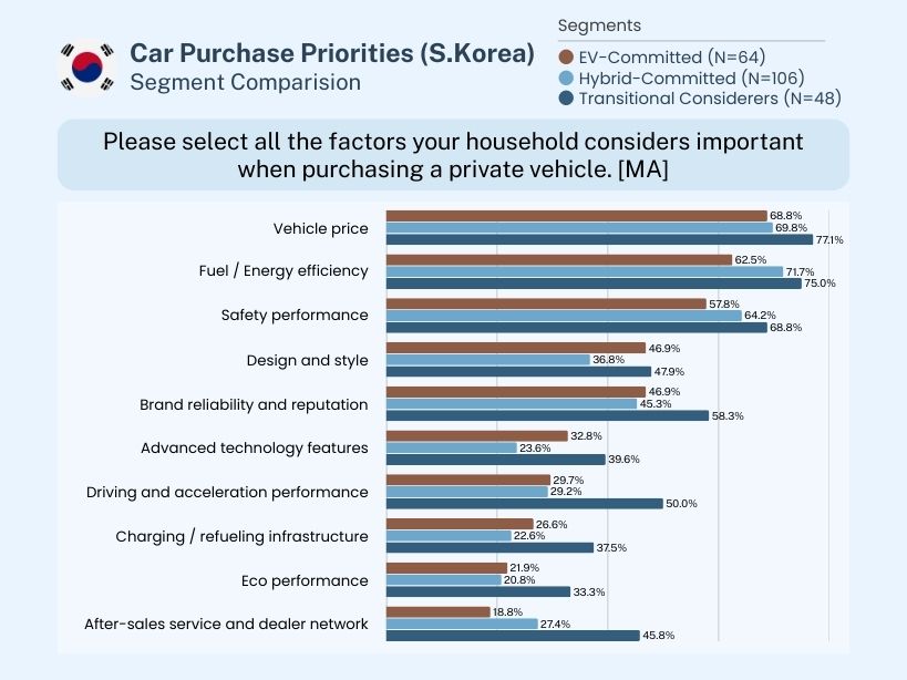 Within this, the EV-Committed segment is more technology-forward (advanced tech 47% vs. hybrid 30%), while Hybrid-Committed lean more to price (76.3%) and after-sales networks (51%). Transitional Considerers presents significant gaps surrounding driving/acceleration performance (61.2%), eco performance (63.3%), and charging infrastructure (51%), showing “EV tech value + readiness check” in parallel.