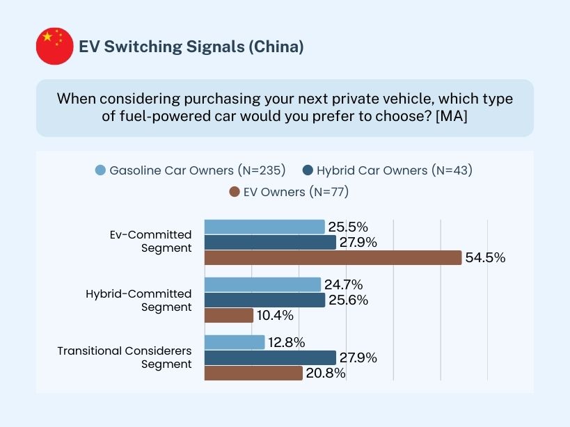 More balanced switching signals between EV and hybrid vehicles are observed in China. The ownership–intention pattern indicates active movement across fuel types, with EV positioned as a viable next-step option for multiple ownership bases.