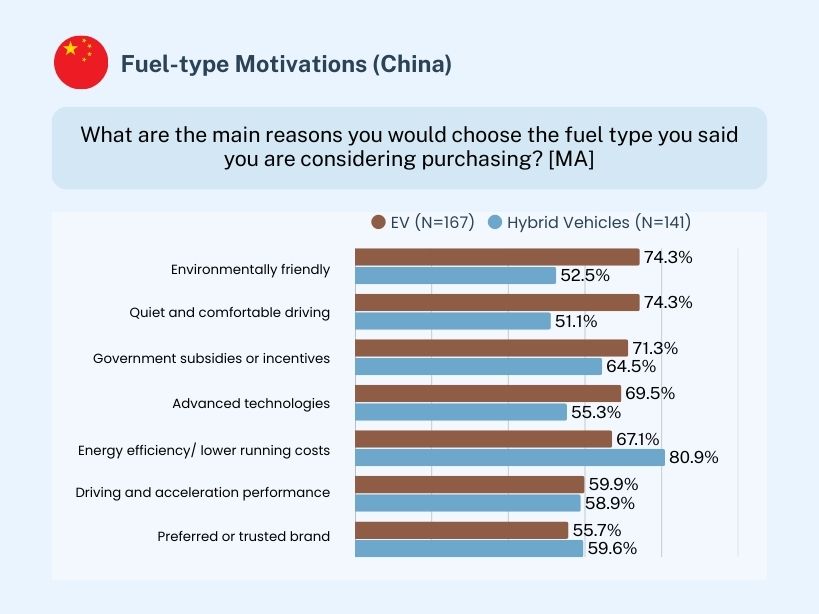 Fuel-type motivations show a similar structure where economic logic remains central. Fuel/energy efficiency is the leading justification for choosing both hybrid vehicles (88%) and EV (83.3%). EV differentiates through added-value motivations—environmentally friendly (78.2% vs. 44.2%), quiet and comfortable driving (74.4% vs. 39.9%), government incentives (67.9% vs. 17.8%), and advanced technology (59% vs 27.1%).
