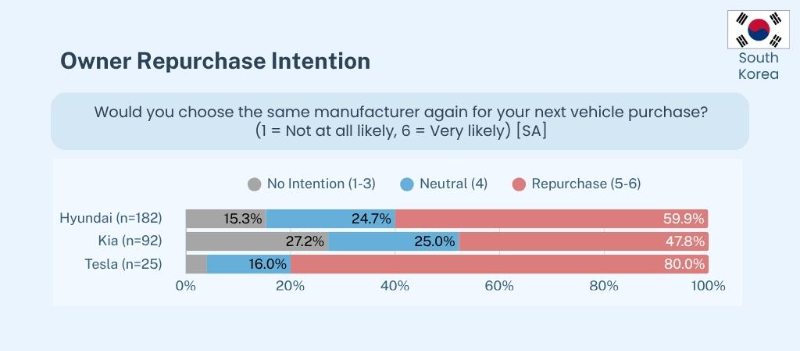 To examine how South Korean consumers assess their experiences with domestic versus American car brands, the following analysis focuses on brands with at least 25 owners in the survey: Hyundai (n=182), Kia (n=92), and Tesla (n=25). Due to its smaller sample size, the results for Tesla are interpreted as directional trends.