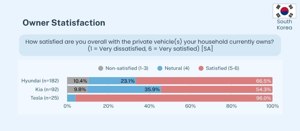 The two main domestic brands, Hyundai and Kia demonstrate solid satisfaction levels with 66.5% and 54.3% of the owners stating satisfaction, though a sizable neutral share suggests moderate enthusiasm. Tesla shows exceptionally high satisfaction of 96%.
