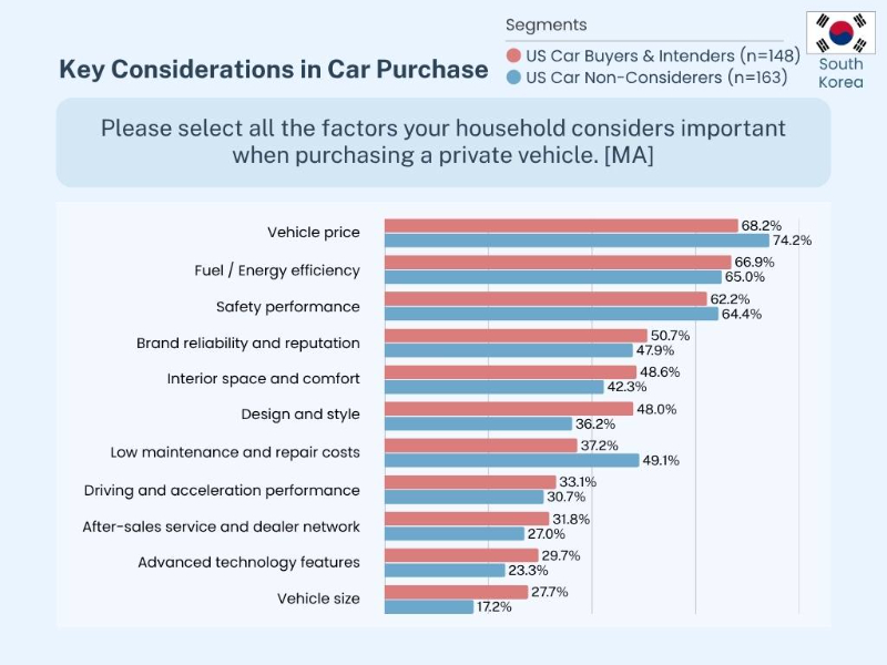 Across both segments, South Korean consumers share highly consistent priorities when purchasing a vehicle. The most commonly cited factors are: