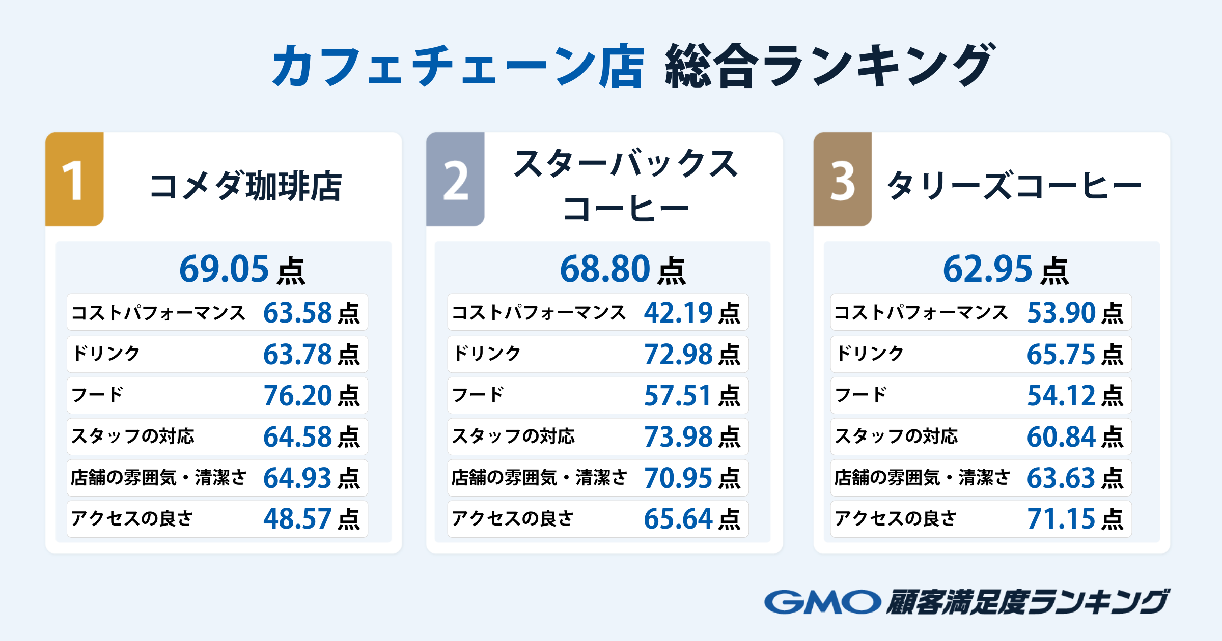 GMOインターネットグループのGMOリサーチ&AI株式会社(代表取締役社長:荻田 剛大)は、同社が運営する「GMO顧客満足度ランキング」における、「カフェチェーン店」(※1)カテゴリのランキング結果を2026年3月18日(水)に公開しました。各サービス利用者が本当に満足しているカフェチェーン店を明らかにする、同カテゴリの総合ランキングでは、コメダ珈琲店が1位に輝きました。